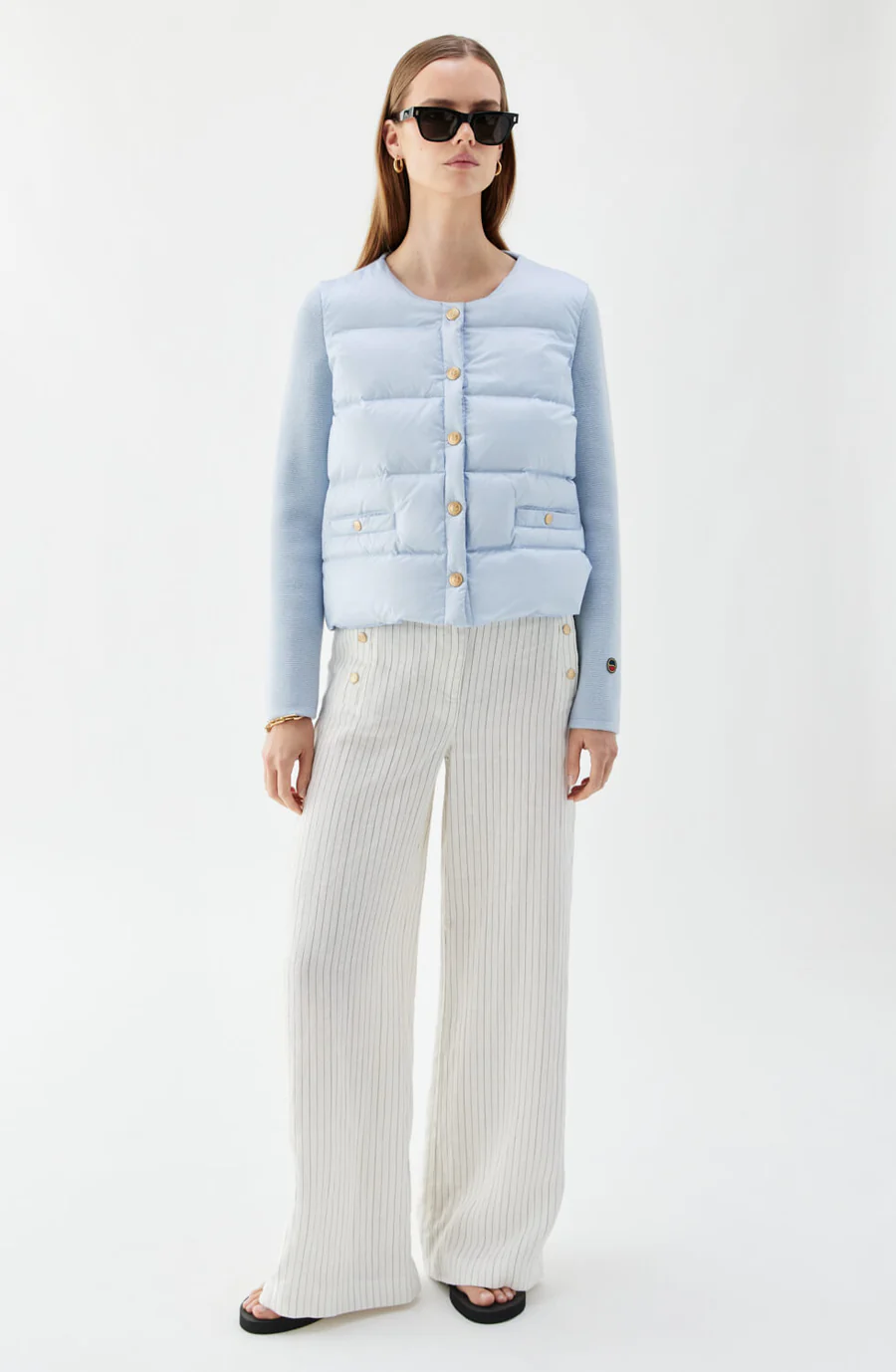 Iva Dunjacka är tillverkad i merinoull och återvunnen nylon, och är en hybrid mellan en lätt dunjacka och en stickad kofta. Framsidan består av nylon och är fylld med dun, medan ärmar och rygg är stickade i mjuk merinoull. Stängningen framtill och fickorna är dekorerade med gyllene B-tryckknappar. Den här jackan håller dig varm och stilsäker under kyliga dagar och kvällar.