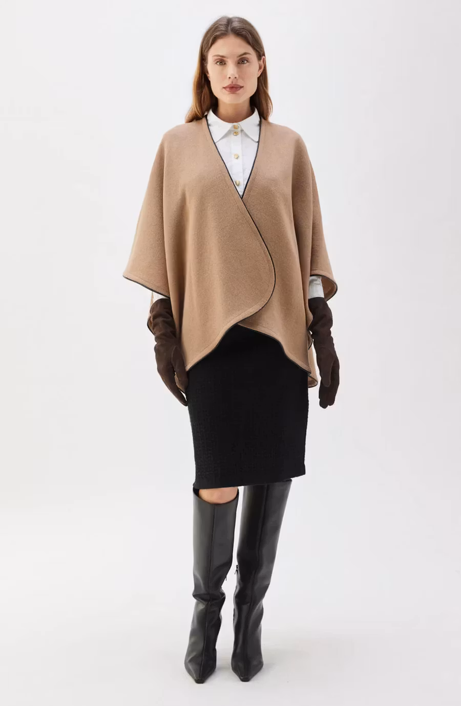 Mio Poncho Piping är en poncho tillverkad i Frankrike av högkvalitativ ull. Denna ponchon har detaljer i en läderliknande kvalitet som skapar en fin kontrast mot den mjuka ullen. Denna ullponcho kan bäras som ett värmande lager både inomhus och utomhus, och kan till och med fungera som ett extra varmt lager ovanpå din kappa. Vi älskar att styla den med ett skärp för att framhäva midjan.