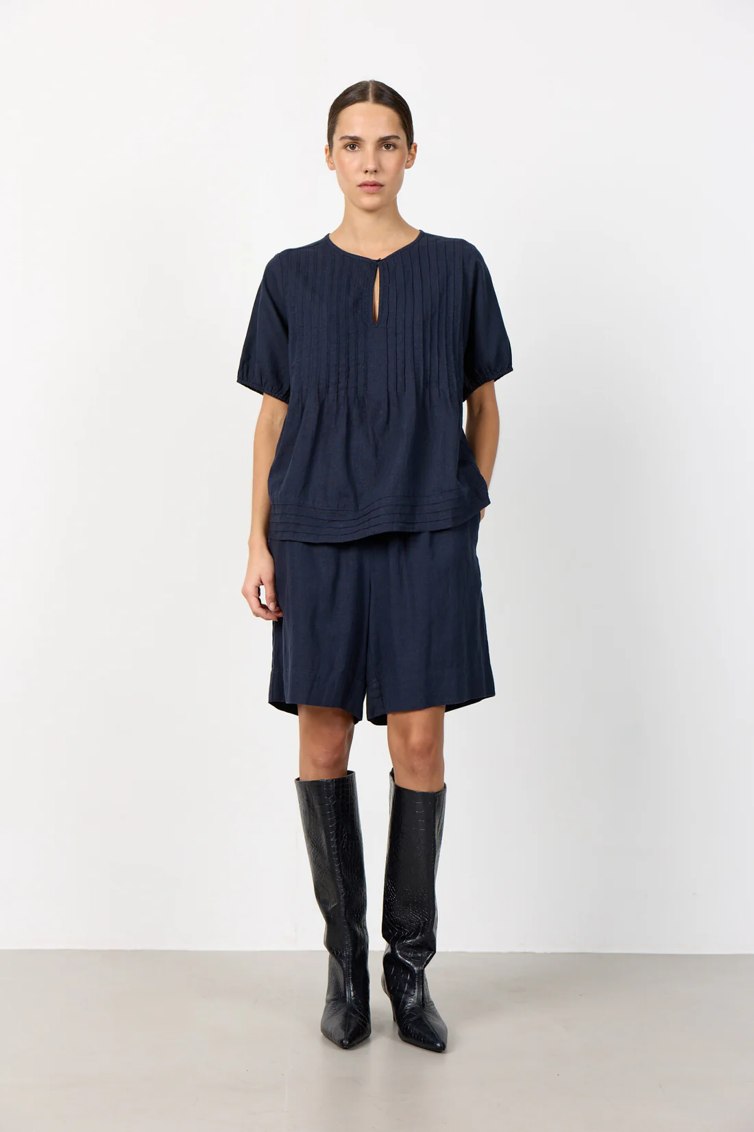LR-NAJA 54 är en härlig blus tillverkad av 55% linne och 45% viskos. Den har en rund halsringning med knäppt nyckelhål, korta ärmar och ett subtilt texturerat mönster. Matcha den med skräddarsydda byxor eller en snygg kjol för en raffinerad look.