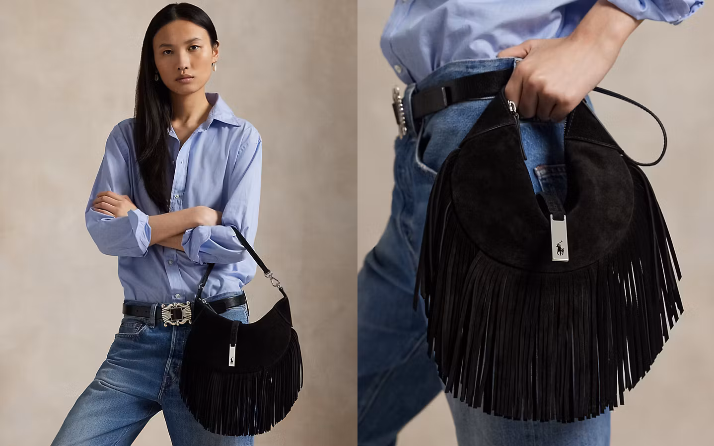 Part of the Polo ID collection, which is inspired by a sense of adventure, romance, and optimism, this Italian sueded calfskin mini shoulder bag features swinging fringe trim and evokes a vivacious elegance and subtle equestrian sensibility with its dual-compartment saddle silhouette that can transform from a shoulder bag into a croissant-shaped wristlet. It's finished with a brass plaque showcasing the silhouette of our signature Pony cut out on gold-tone brass hardware reminiscent of vintage ID bracelets.